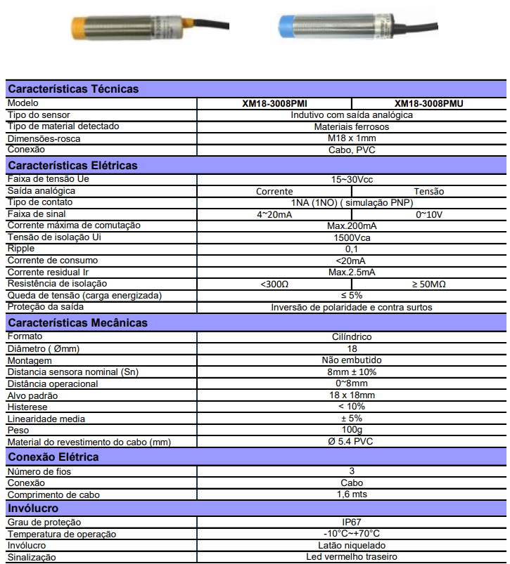 Sensor Indutivo Analógico BHS XM18-3008PMU 8mm 15~30Vcc 0~10V 3 Fios