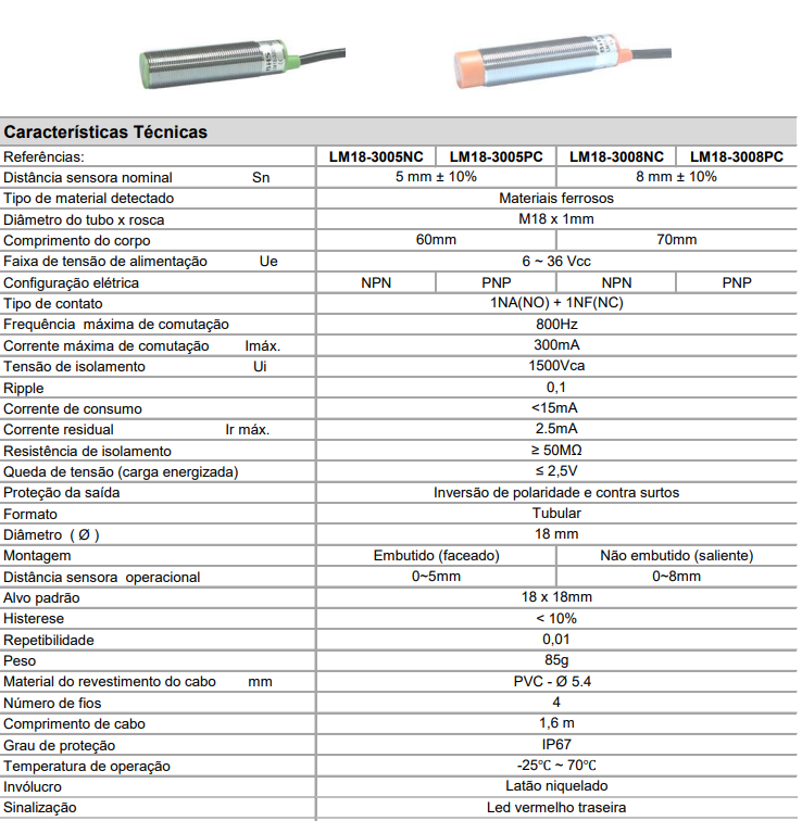 Sensor Indutivo BHS LM18-3005PC 5mm 6~36Vcc PNP NA+NF 4 Fios