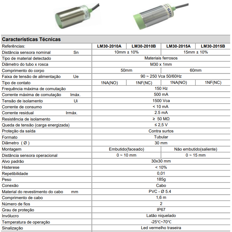 O Sensor Indutivo BHS modelo LM30-2015B é um componente de alta performance, projetado para aplicações que exigem um alcance de detecção superior em sistemas que operam em Corrente Alternada (Vca). Por ser um modelo não faceado (saliente), ele oferece uma distância de sensoriamento de 15mm, sendo ideal para monitorar objetos metálicos em máquinas onde não é possível uma aproximação muito próxima do sensor.