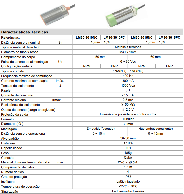 Sensor Indutivo BHS LM30-3010PC 10mm 6~36Vcc PNP NA+NF 4 Fios