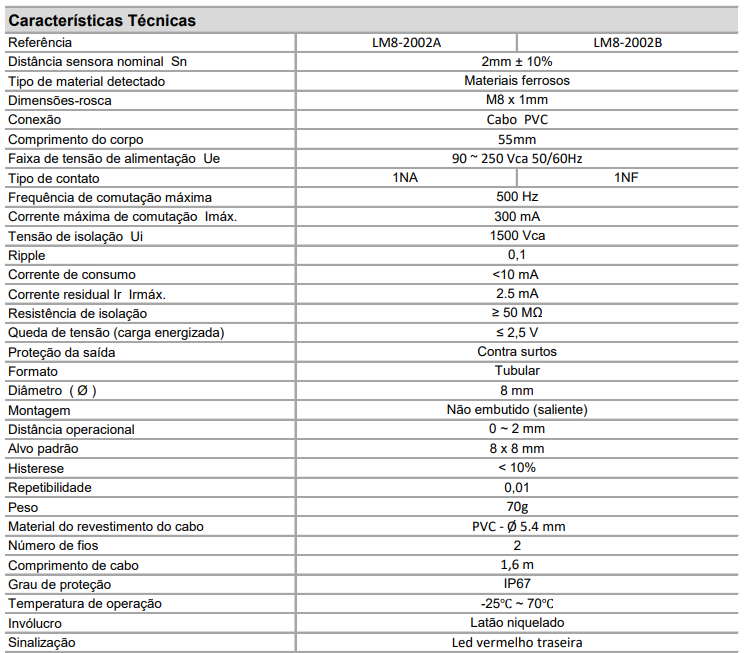 Sensor Indutivo BHS LM8-2002B 2mm 90~250Vca NF 2 Fios