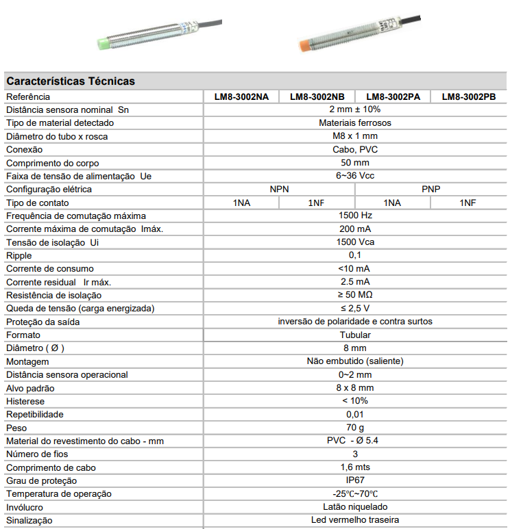 Sensor Indutivo BHS LM8-3002NB 2mm 6~36Vcc NPN NF 3 Fios